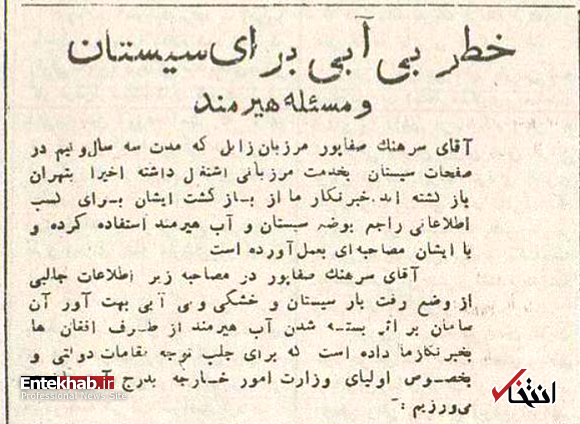 سرویس تاریخ «انتخاب»؛ سرهنگ صفاپور مرزبان زابل که از سال ۱۳۲۳ تا ۱۳۲۶ مدت سه سال در صفحات سیستان به خدمت مرزبانی اشتغال داشت، در اسفندماه ۱۳۲۶ طی گفت‌وگویی با خبرنگار روزنامه اطلاعات از وضع رقت‌بار سیستان و خشکی و بی‌آبی بهت‌آور آن سامان بر اثر بسته شدن آب هیرمند از طرف افغان‌ها خبر داد. متن این گفت‌وگو که روز چهارشنبه ۱۹ اسفند ۱۳۲۶ در روزنامه اطلاعات منتشر شد به این شرح بود: