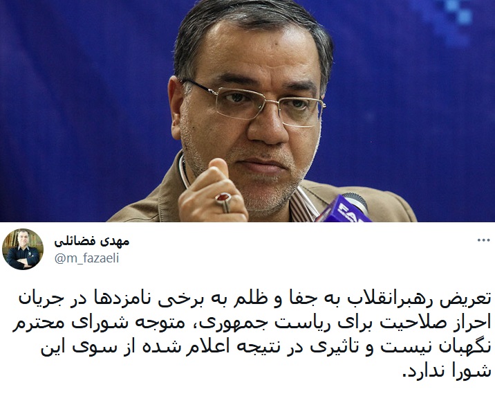 مهدی فضائلی، معاون دفتر حفظ و نشر آثار رهبری در توییتی نوشت: تعریض رهبرانقلاب به جفا و ظلم به برخی نامزدها در جریان احراز صلاحیت برای ریاست جمهوری، متوجه شورای محترم نگهبان نیست و تاثیری در نتیجه اعلام شده از سوی این شورا ندارد.
