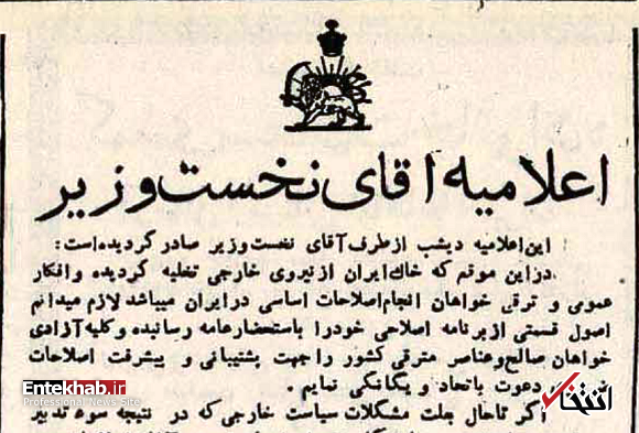 همین عناصر معدود با سوءاستفاده از آزادی و موازین دموکراتیک تصور میکنند به آنها اجازه داده خواهد شد که به وسیله دسیسه و انتریک و نشر اکاذیب و انواع تهمت مانع اجرای نیات مترقی و اصلاحطلب دولت گردند و باز با ایجاد حکومت وحشت و سرکوبی آزادیخواهان مانع ترقیات و اصلاحات شوند، غافل از اینکه اینجانب آنی این سوءاستفاده از آزادی و دموکراسی را تحمل ننموده و با قدرت قانون عناصر فاسد را که بر علیه استقلال و ترقیات کشور ایران دسیسه میکنند به جای خود خواهم نشاند و آنان را که با نیات اصلاحطلبانه اینجانب همکاری و همراهی نمایند از جان شیرین عزیزتر خواهم داشت. بدیهی است برای این منظورِ مقدس و تامین آزادی و آسایش حقیقی در سرتاسر کشور به [ناخوانا] عموم آزادیخواهان و عناصر وطنپرست کشور متکی میباشم و [ناخوانا] همآهنگی و اشتراک مساعی دارم. اما کیفیت اصلاحات: