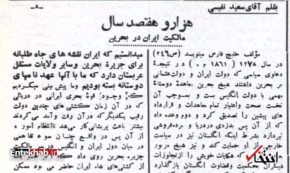 در همین سال ۱۳۱۳ در نتیجهی مشاجره بر سر جزایر بحرین و عزیمت دو کشتی جنگی انگلیسی با دویست سرباز و دو توپ سنگین قلعهکوب از بمبئی که در ماه ربیعالاول آن سال روی داده است در ممالک شرق همهجا همهمهای برخاست و حتی در جراید هندوستان منعکس شد و مطبوعات هند به دولت ایران گوشه و کنایه میزدند که مالک واقعی این جزایر ایران است و چگونه میگذراند که دیگری در آنجا مداخلات مالکانه کند!