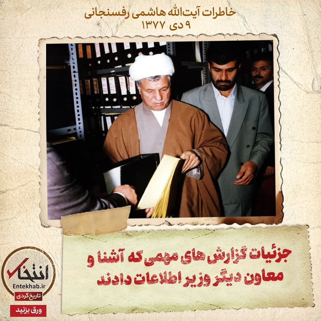 خاطرات آیت الله هاشمی رفسنجانی، ۹ دی ۱۳۷۷: جزییات گزارش های مهمی که آشنا و دیگر معاونان وزیر اطلاعات دادند