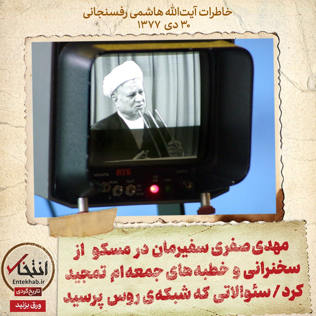 مصاحبهاى با تلويزيون ان تی وی (NTV) روسيه انجام دادم. مصاحبهگر، مدير شبكه است و فارسى را خوب مىداند و سؤالات را با زبان فارسى مطرح كرد. دربارة نتايج انقلاب، آينده انقلاب، پيروزى آقاى [سیدمحمد] خاتمى، علىرغم حمايت آيتالله خامنهاى از آقاى [علیاکبر] ناطق [نوری]، روابط با آمريكا، صنايع موشكى، مسأله سلمان رشدى و.. سؤال داشت.