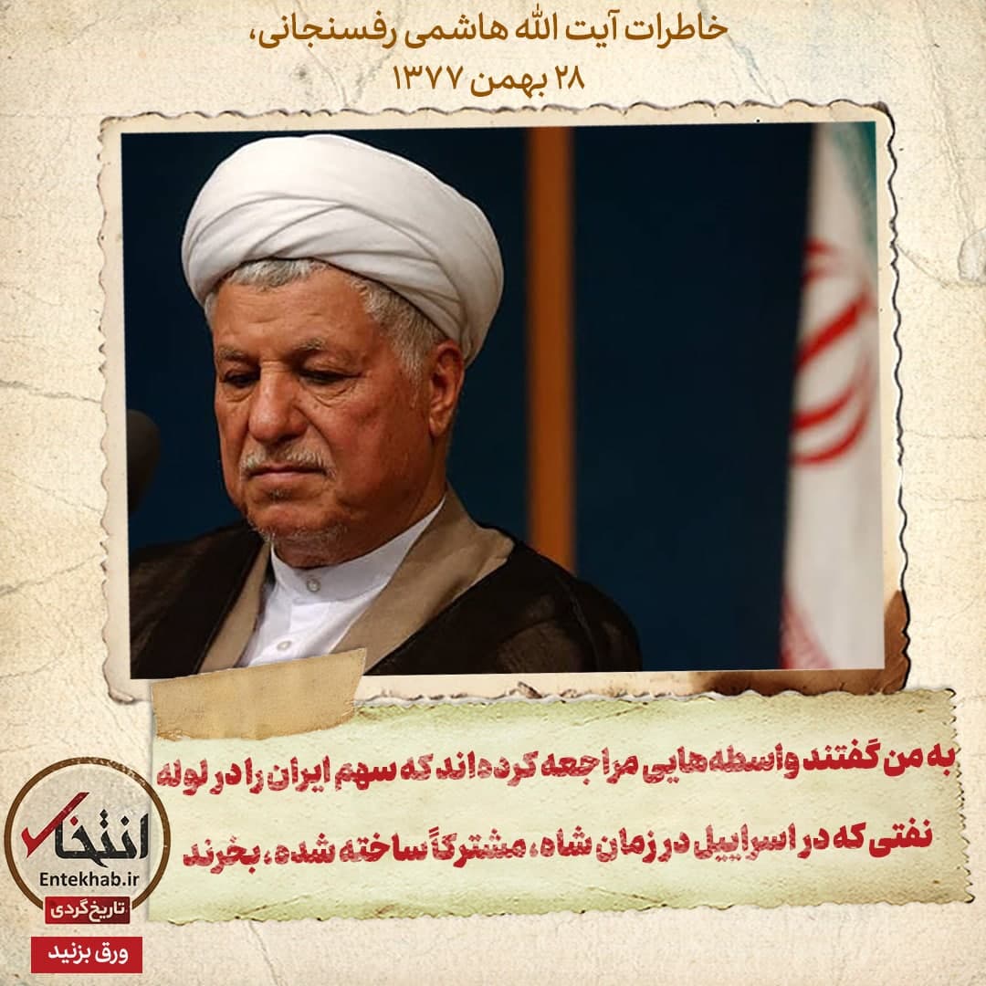خاطرات آیت الله هاشمی رفسنجانی، ۲۸ بهمن ۱۳۷۷: به من گفتند واسطه‌هایی مراجعه کرده اند که سهم ایران را در لوله نفتی که در اسرائیل در زمان شاه مشترکا ساخته شده، بخرند